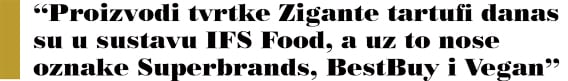 Već sam spomenuo da se obiteljski bavimo tartufima već gotovo pola stoljeća. Godine 1996. kupili smo prve strojeve za preradu te pokrenuli malu proizvodnju u obiteljskoj kući. Prve smo proizvode plasirali 1998. godine. Godine 2000. otvorili smo prvu specijaliziranu trgovinu tartufa, u kojoj su se prvi put legalno mogli kupiti tartufi i proizvodi od tartufa. Nakon toga nastavili smo s otvaranjem trgovina, razvijanjem linije proizvoda te se tvrtka već više od 20 godina neprestano razvija i napreduje stvarajući trendove na tržištu. Proizvodi tvrtke Zigante tartufi danas su u sustavu IFS Food, a uz to nose oznake Superbrands, BestBuy i Vegan.