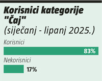 Poznato je da čajevi mogu imati brojne zdravstvene benefite te da se nerijetko koriste u svrhu relaksacije. Imajući to na umu, čini se da dobar dio Hrvata cijeni navedene benefite čajeva jer ih 83% u dobi od 16 do 64 godine barem ponekad popije šalicu čaja. Kada je riječ o segmentaciji, velikih korisnika (heavy users), koji piju čaj barem dva do tri puta tjedno, brojimo 35%. Srednjih korisnika (medium users), koji piju čaj jednom do tri puta mjesečno, imamo 22%, a malih je korisnika (light users), koji piju čaj jednom mjesečno ili rjeđe, ukupno 27%. Gotovo trećina ispitanika navodi kako im je jako bitno koju marku čaja kupuju.