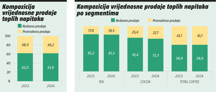 U 2024. godini, porast prodaje putem promocija zabilježile su skupine čaja i kakaa, dok je segment kave održao jednak udio promotivne prodaje u odnosu na prijašnju godinu. Uz to, segment kave bilježi natprosječan udio prodaje na promocijama s obzirom na kategoriju toplih napitaka.