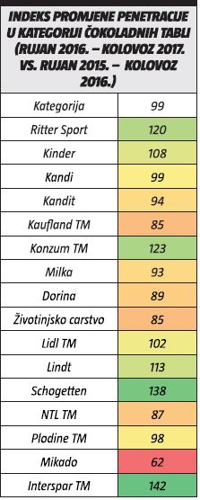 Pritom Kandit, Milka, Dorina, Mikado, NTL TM i Kaufland TM gube penetraciju, dok Ritter Sport, Kinder, Konzum TM, Lindt, Interspar TM i Schogetten povećavaju penetraciju.