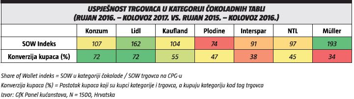 Tako npr. Müller ima najveći SOW indeks (193), što znači da Müller ostvaruje dvostruko veći udio u novčaniku svog kupca u kategoriji čokolada u odnosu na Müllerov udio u novčaniku svog kupca na total CPG-u. Lidl ima sličnu priču s visokim SOW indeksom u čokoladi.
