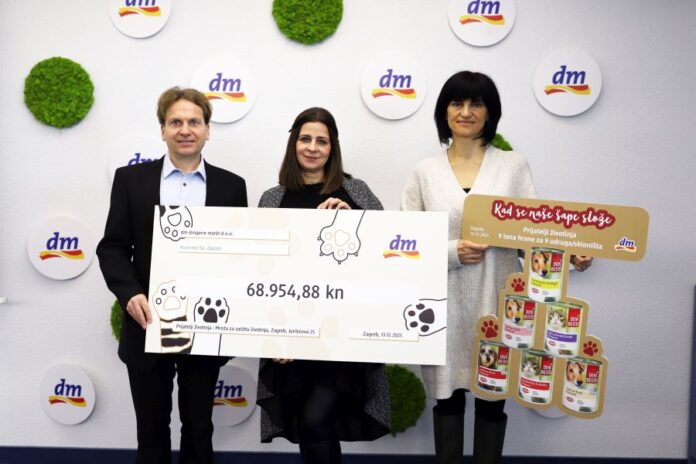 U ponedjeljak, 13. prosinca, dm je udruzi Prijatelji životinja predao donaciju od 23.124 konzerve hrane namijenjene životinjama o kojima brinu Udruga Farmica iz Našica, Udruga Pobjede (Azil Osijek) i Mandičina udruga iz Osijeka, Sklonište Dumovec iz Zagreba, Udruga Lajka iz Novigrada Podravskog, udruga Šapama od srca iz Makarske, udruga SOS Šape iz Poreča, Udruga Berta (Sklonište Kninske njuškice) i Udruga Šibenske šape.