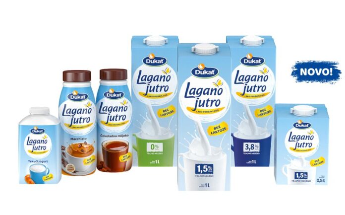 Linija mliječnih proizvoda bez laktoze Dukat Lagano jutro dostupna je u novom ruhu – u praktičnijem pakiranju novog vizualnog identiteta. Uz moderniji dizajn, liniju su obogatila dva nova proizvoda: Dukat Lagano jutro mlijeko s 3,8 posto mliječne masti od jedne litre i Dukat Lagano jutro mlijeko s 1,5 posto mliječne masti od pola litre. Tako sada u bogatom okusu punomasnog mlijeka mogu uživati i oni intolerantni na laktozu*, dok će novo, manje pakiranje “klasika” ove linije, Dukat Lagano jutro mlijeko s 1,5 posto mliječne masti, biti izvrstan odabir za brzu nadoknadu kalcija, bjelančevina i vitamina, bez nelagode.