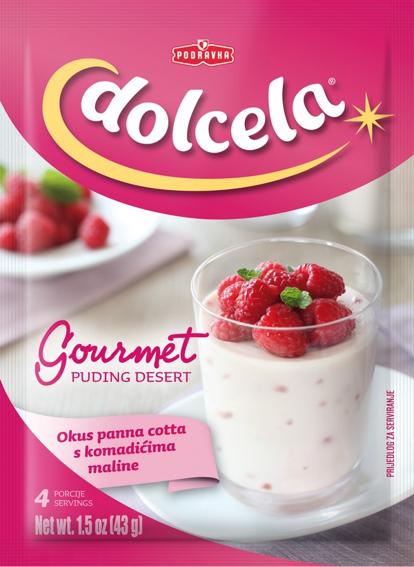 Liniju Dolcela gourmet pudinga upotpunili smo novom, zanimljivom kombinacijom: puding panna cotta s komadićima malina. Panna cotta je omiljena talijanska slastica s kuhanim slatkim vrhnjem koju poslužujemo uz voćni preljev ili voće po vlastitom izboru, a Dolcela vam ju servira i u obliku raskošnog pudinga.