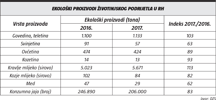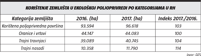 Ukupni udio površina pod ekološkim uzgojem u poljoprivrednom zemljištu RH i dalje je oko 6 posto. Kada je riječ o potrošnji na ekološke proizvode, novih podataka nema. Barata se s podacima iz 2014. godine prema kojima je potrošnja na ekološke proizvode u maloprodaji iznosila oko 99 milijuna eura, što prosječnu potrošnju po stanovniku postavlja na razinu od 24 eura. Daleko smo tu od jedne Švicarske, ali ako se stavimo u ravan s usporedivim zemljama taj iznos i nije tako mali: eko tržište u Češkoj vrijedno je 79 milijuna eura, u Sloveniji 49 milijuna eura, u Mađarskoj svega 30 milijuna eura itd.