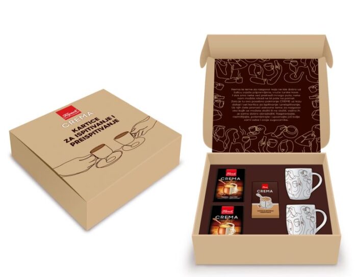 Nema teme za razgovor koja ne ide dobro uz šalicu vruće turske kave, a Franck predstavlja mali dodatak koji će razgovore s prijateljima ili pak upoznavanje novih učiniti još zanimljivijim. Riječ je o posebnom pakiranju Crema kave u kojem dolazi i set kartica za ispitivanje i preispitivanje te dvije šalice za kavu. Kartice donose različita pitanja i potiču diskusiju o raznovrsnim temama kojim možete začiniti kavu. Odaberite karticu i otvorite zabavnu diskusiju u kojoj ćete bolje upoznati sebe i svoje sugovornike. Ovo posebno pakiranje dostupno je na webshopu i Franck Experience Storeu u zagrebačkoj Teslinoj ulici 7. Ujedno, posebno pakiranje Franck Crema kave od 400 grama uz kartice ekskluzivno je dostupno na policama Konzuma.