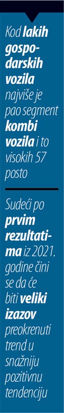 I tržište vozila, kako onih osobnih, tako i lakih gospodarskih, u prošloj je 2020. godini doživjelo veliki “pandemijski” šok, što se posebno odnosi na segment novih osobnih vozila kod kojih je zabilježen pad od čak 42,7 posto u odnosu na prethodnu godinu. Nešto je blaži, ali i dalje vrlo visoki pad zabilježen i na tržištu novih lakih gospodarskih vozila od 23,2 posto.