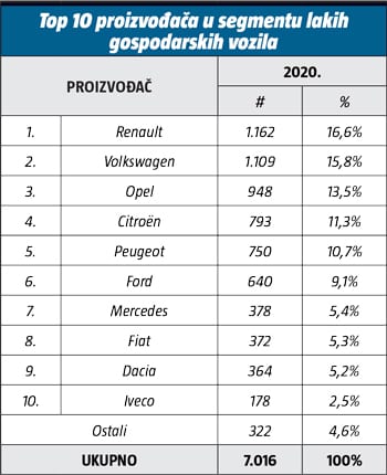 Renault je zadržao vodeću poziciju među proizvođačima lakih gospodarskih vozila s ukupno 1.162 prodana vozila u 2020., što je pad od 30,8 posto u odnosu na prethodnu godinu. Drugo mjesto također je zadržao Volkswagen koji je prodao 1.109 vozila uz nešto blaži godišnji pad od 22,6 posto. Opel se probio do trećeg mjesta s 948 prodanih vozila, što je 15,2 posto manje u usporedbi s ranijom godinom. Među vodećih deset proizvođača pozitivan trend prodaje u 2020. godini ostvario je jedino Ford koji je prodao 640 novih lakih gospodarskih vozila ili 32,2 posto više nego 2019. godine.