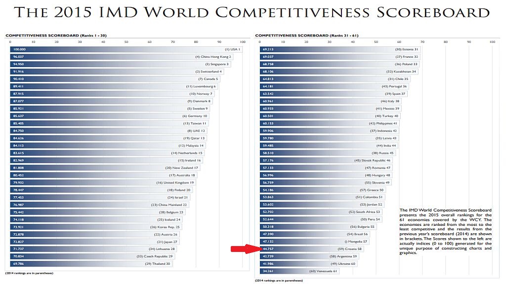 konkurentnostPrema Godišnjaku svjetske konkurentnosti 2015. Hrvatska je zauzela 58. mjesto od ukupno 61. vodeće svjetske ekonomije, što je poboljšanje za jedno mjesto na ljestvici.
