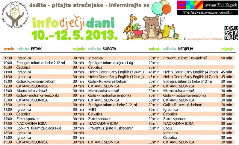 Udruga UPRI i Avenue Mall Zagreb pozvali su sve zainteresirane na manifestaciju Info dječji dani koja će se održati od 10. do 12. svibnja 2013. godine u Avenue Mallu Zagreb, od 9:00 do 20:00 h.