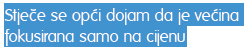 Razvoj proizvoda još donekle i nije ugrožen jer se pokušavamo približiti potrošačima na sve moguće načine, premda svakodnevno čujemo i najave rezanja neprofitnih asortimana. A promocija i pozicioniranje je zbog rezanja troškova pomalo u drugom planu. Nekako se stječe opći dojam da je većina fokusirana upravo na cijenu.