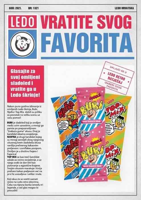 Početak svake nove godine na neki način označava i početak sladoledne sezone, a Ledo je 2021. godinu započeo na najslađi i najuzbudljiviji mogući način. Motivirani velikim interesom svojih potrošača koji najljepše uspomene iz djetinjstva i mladosti vežu uz legendarne Ledo sladolede, pokrenut je Ledo “RETRO” natječaj putem kojeg potrošači sami mogu odabrati koji će se legendarni sladoled ponovno vratiti u Ledo škrinje.