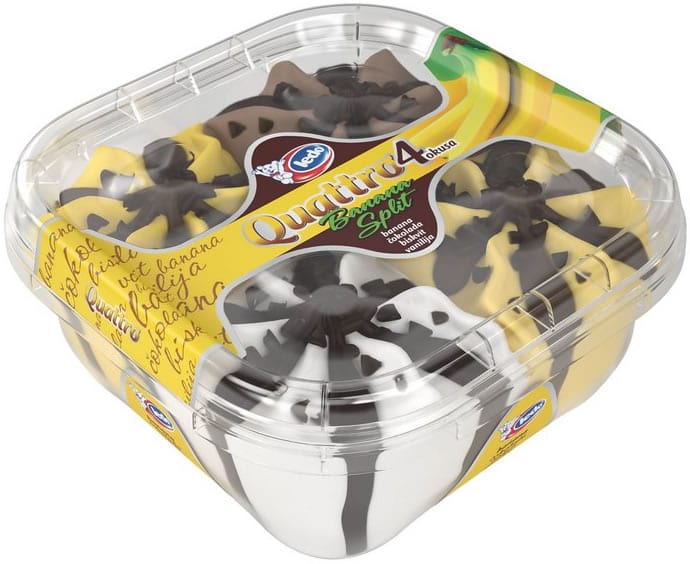 Mini pakiranja već poznatih Quattro sladoleda dobila su još jednog člana – Mini Quattro Banana Split – neodoljivi spoj banane i najpopularnijih sladolednih okusa čokolade, vanilije i biskvita.