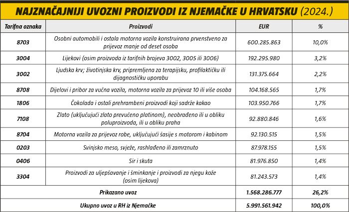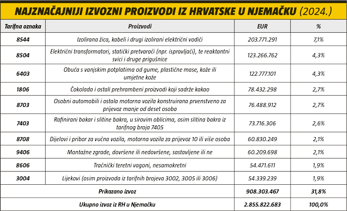 Pritom iz Njemačke najviše uvozimo automobile, lijekove i električne komponente, dok u izvozu prednjače izolirane žice, električni transformatori i obuća.