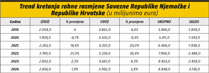 U usporedbi s 2023. godinom, zabilježen je porast izvoza u Njemačku za gotovo 2%, dok je uvoz iz Njemačke istodobno porastao za gotovo 6%. Ovisno o godini, Njemačka zauzima prvo ili drugo mjesto među najvažnijim vanjskotrgovinskim partnerima Republike Hrvatske, izmjenjujući se na toj poziciji s Italijom.