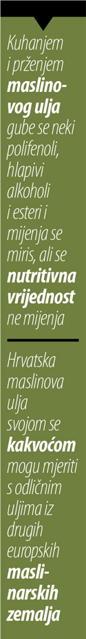Kuhanjem i prženjem gube se neki polifenoli, hlapivi alkoholi i esteri i mijenja se miris, ali se nutritivna vrijednost ne mijenja. Štoviše, probavljivost maslinovog ulja ne mijenja se čak i ako se više puta uzastopce upotrebljava za prženje! Osim toga, maslinovo ulje u sebi sadrži stabilizatore koji štite hranu od gubitka hranjivih tvari prilikom kuhanja, budući da takvo ulje hranu samo obloži pa jedemo manje masno.