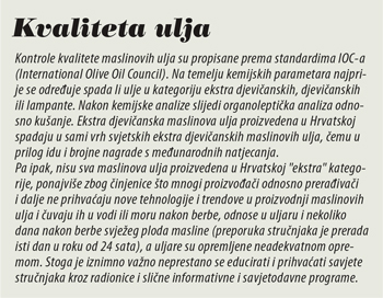 “Za proizvodnju ekstra djevičanskog maslinovog ulja koriste se plodovi koji se podvrgavaju isključivo mehaničkim postupcima, u uvjetima koji ne dovode do promjena sastojaka ulja te bez dodataka pomoćnih sredstava kemijskog ili biokemijskog djelovanja. Drugim riječima, ekstra djevičansko maslinovo ulje je ono najbolje što se dobiva izravno iz ploda masline i u nutritivnom i u organoleptičkom smislu”, naglašava nutricionistica Sandra Krstev Barać, izvršna urednica portala Vitamini.hr.