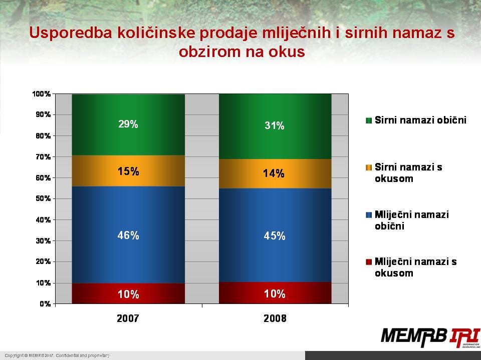 • Unutar svih namaza s okusom gotovo cijela prodaja odlazi na klasične namaze s okusom, dok manji dio odlaze na ‘light’ namaze s okusom. Ista je situacija i s namazima bez okusa gdje na ‘light’ segment otpada mali količinski udio.
