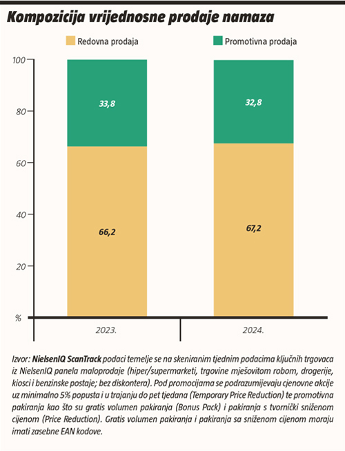 U okviru promatrane skupine namaza ukupno je 32,8% vrijednosne prodaje proizišlo kao rezultat cjenovnih akcija ili promotivnih pakiranja.