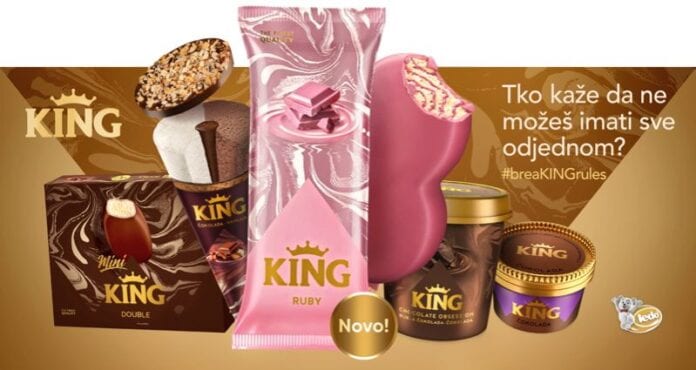 King asortiman je proširen i multipakiranjima pa se tako tijekom ljeta uz King Double, može uživati i u praktičnim King Excite i Obsession multipakiranjima, kao i King čašama od 450 ml. Najveća inovacija u King asortimanu te nositelj cijele BreaKING rules kampanje ove godine zasigurno je King Ruby štapić – sladoled okusa prženog badema s unutarnjim i vanjskim preljevom od prirodne, ružičaste Ruby čokolade. Cjelokupnu King liniju proizvoda tako sada čini ukupno 18 sladoleda – na štapiću, korneta, sladoleda u manjim čašicama kao i većim čašama i multipakiranju što potrošačima omogućava širok izbor opcija, odnosno okusa, formata i veličina kojima je zajednička najviša kvaliteta sastojaka i jedinstvenost okusa.