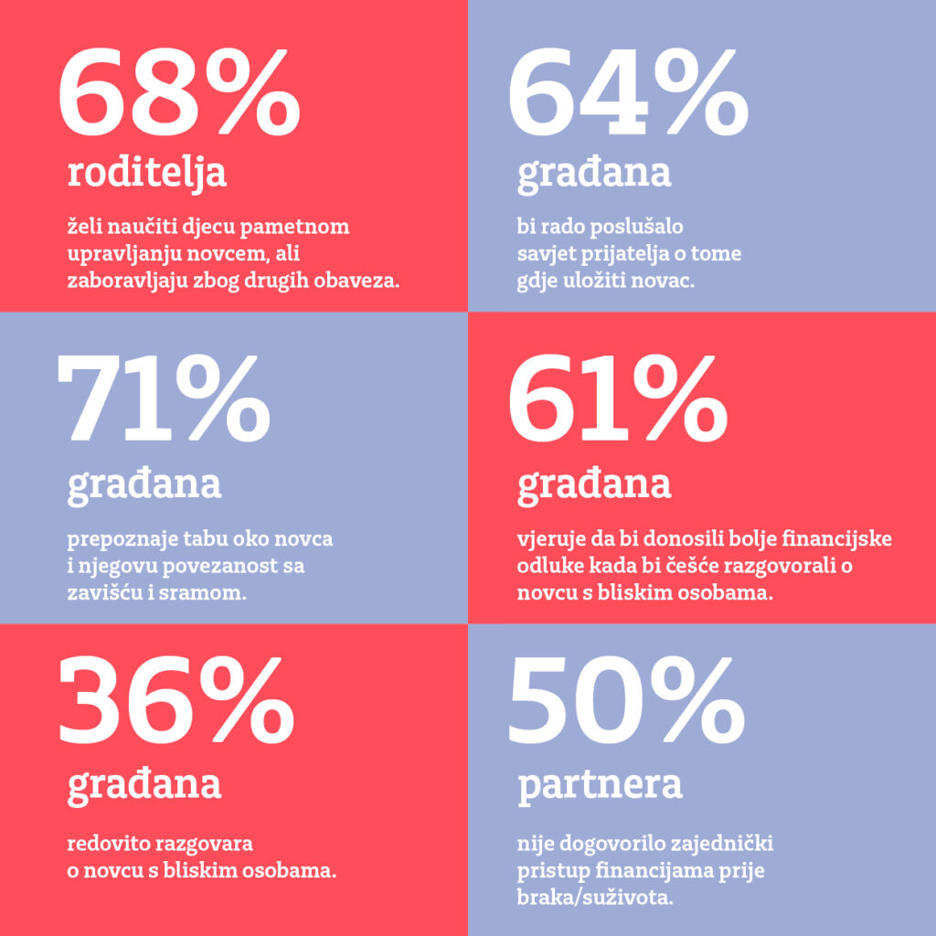 Već samo ovi dijelovi rezultata sveobuhvatnog istraživanja svjedoče o nedovoljnoj osviještenosti građana o ulozi razgovora o novcu te o tome da tretiranje financija kao tabu teme može negativno utjecati na svakodnevnicu i životne planove.
