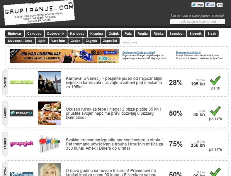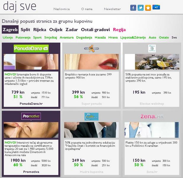 – Trenutno na hrvatskom tržištu ima oko 40 portala za grupnu kupovinu i praćenje svih na jednom mjestu posebno je praktično za one koji žele u svakom trenutku vidjeti sve što se nudi na tržištu grupnih popusta. Agregatori tu imaju veliku ulogu, jer povećavaju vidljivost portalima, a korisnicima štede vrijeme, rekao je Antonio Faletar, suosnivač i vlasnik portala DajSve.com, jednog od prva dva agregatora u Hrvatskoj.
