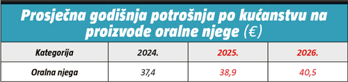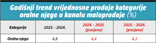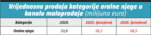 Kategorija oralne njege zabilježila je pozitivan rast u Hrvatskoj u 2024. godini, kako u vrijednosnom, tako i u količinskom smislu, pri čemu je rast vrijednosti bio izraženiji od rasta volumena. Oralna njega ima koristi od činjenice da je riječ o osnovnoj kategoriji unutar tržišta ljepote i osobne njege, koja obuhvaća temeljne proizvode poput zubnih pasti i ručnih četkica za zube, ali i specifičnije kategorije kao što su proizvodi za njegu zubnih proteza i zubni konac. Naime, higijenske navike potrošača i dalje se poboljšavaju, uz sve veću brigu za oralno zdravlje. Ovakva visoka potražnja potiče razvoj novih proizvoda, od zubnih pasti s unaprijeđenim formulama koje nude svjež dah, uklanjanje plaka, izbjeljivanje, zaštitu osjetljivih desni ili sveobuhvatnu njegu, do električnih četkica za zube koje koriste najnovija tehnološka dostignuća.