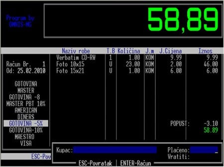 Program je jednostavan, pregledan, efikasan i pouzdan. Omogućava više načina plaćanja, popuste i slično.