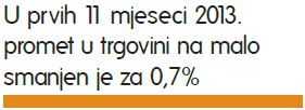 Prošla 2013. godina obilježena je nastavkom negativnih kretanja u trgovini na malo, što predstavlja nastavak krize petu godinu zaredom. U kumulativu za razdoblje siječanj-studeni 2013. promet u trgovini na malo smanjen je za 0,7% u odnosu na isto razdoblje 2012. godine.