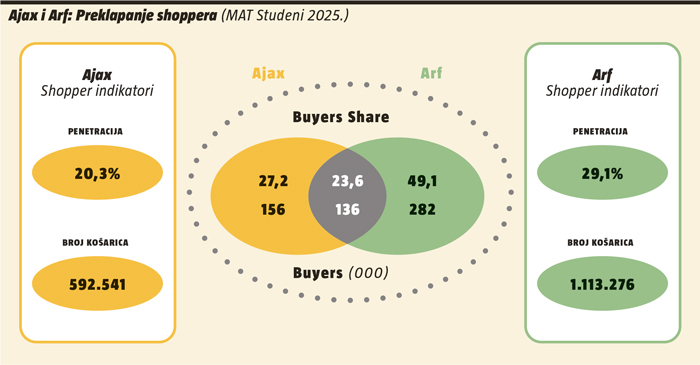 Analiza preklapanja shoppera Arfa i Ajaxa pokazuje da brendovi dijele svakog četvrtog shoppera. Svaki četvrti shopper kategorije kupuje Ajax, dok Arf ekskluzivno zadržava svakog drugog shoppera. Arf doseže penetraciju od 29%, što je značajno više od Ajaxovih 20%. Uz to, Arf je uspješniji u poticanju frekvencije kupnje svojih shoppera te je prisutan u dvostruko većem broju FMCG košarica u odnosu na Ajax. Statička analiza pokazatelja ide u prilog Arfu, no dinamička analiza trendova favorizira Ajax, koji povećava broj shoppera, dok Arf bilježi negativan penetracijski trend.