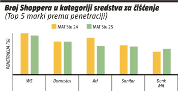Uz stabilnu penetraciju te blagi rast frekvencije kupnje i volumena po kupnji, kategorija sredstava za čišćenje u razdoblju MAT studeni 2025. bilježi i količinski i vrijednosni rast. Domestos je vrijednosno vodeća marka među brendovima, dok je W5 vodeća među trgovačkim markama. Među pet vodećih marki prema broju shoppera (W5, Domestos, Arf, Sanitar i Denkmit), W5 se ističe 43-postotnom konverzijom kategorijskih shoppera. Istodobno, W5 dijeli negativan penetracijski trend s Arfom i Sanitarom. Domestos zadržava stabilnu penetraciju, dok je Denkmit jedini među vodećima koji povećava broj shoppera.