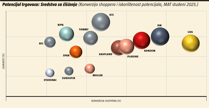 Među 13 analiziranih trgovaca – Bipa, dm, Müller, KTC i Plodine – bilježe veću iskorištenost potencijala kategorije sredstava za čišćenje u odnosu na iskorištenost potencijala koju ostvaruju na razini ukupnog FMCG-a. Bipa prednjači prema VPE-u (iskorištenosti vrijednosnog potencijala kategorije): njezin kategorijski VPE relativno je peterostruko viši u odnosu na vrijednosnu eksploataciju potencijala ukupnog FMCG-a.