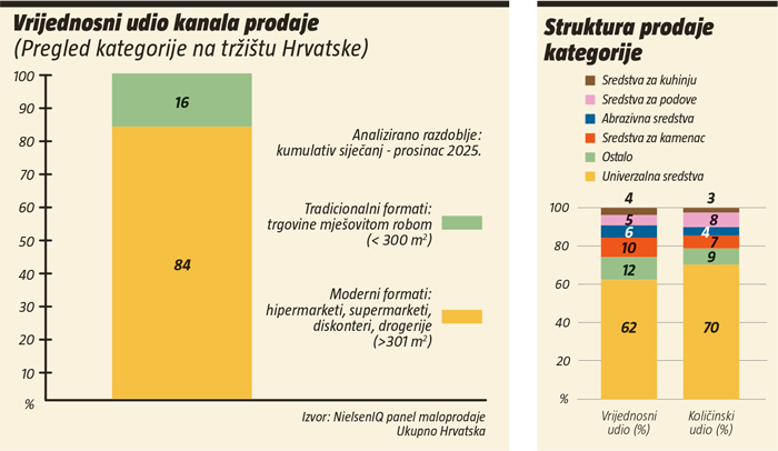 U 2025. godini grupa proizvoda za čišćenje zabilježila je rast vrijednosne prodaje od 5%. Segmenti koji najviše doprinose vrijednosnom rastu prodaje kategorije su sredstva za otklanjanje kamenca, univerzalna sredstva za čišćenje te ostala sredstva za čišćenje. Uz to, univerzalna sredstva čine najveći segment unutar kategorije sa 62,4% udjela u vrijednosnoj prodaji. Slijede ga ostala sredstva za čišćenje s 11,7% udjela te sredstva za otklanjanje kamenca s 10,2% udjela. Također, jednoznamenkastim udjelima u vrijednosnoj prodaji kategorije pridonose i abrazivna sredstva, sredstva za čišćenje podova te sredstva za čišćenje kuhinje.