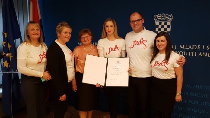 Svečana dodjela nagrade održana je u prostorijama Ministarstva, a tom prilikom članica Upravnog odbora Udruge PULS Petra Čolig istaknula je: “Iznimno smo zahvalni i ponosni što je Ministarstvo prepoznalo naš rad i naše zalaganje tijekom godina, tim više što je ovo najveće priznanje na razini Republike Hrvatske. Udruga PULS je izrazito aktivna udruga te smo pokazali kako se uz dobru volju može napraviti puno, a odricanje vlastitog slobodnog vremena kako bismo pomogli drugima donosi radost ne samo onima kojima pomažemo, već i osobno zadovoljstvo.”