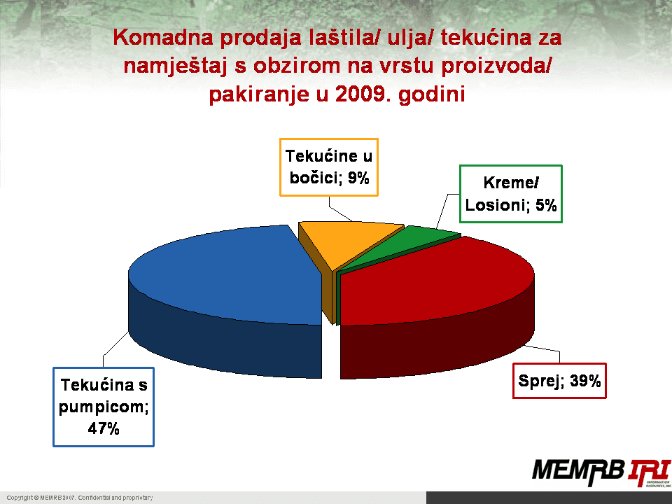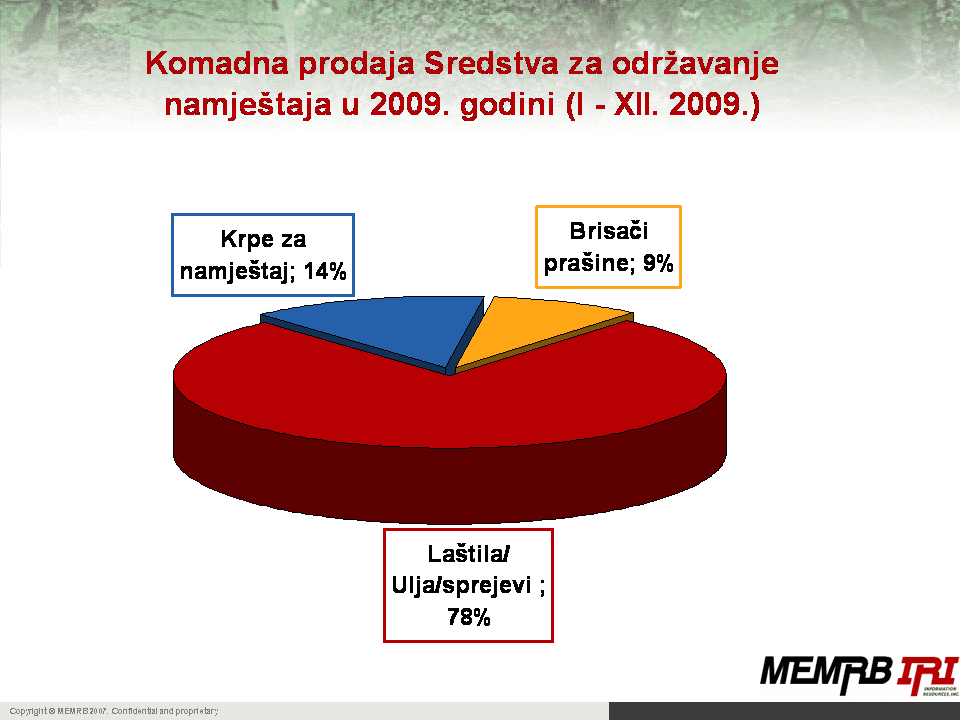 Najveći segment koji zapravo drži ovu kategoriju jesu sprejevi/ulja/laštila koji nose oko 80 % komadne prodaje. Krpice za namještaj nose 14 %, a brisači prašine 9 % komadne prodaje.