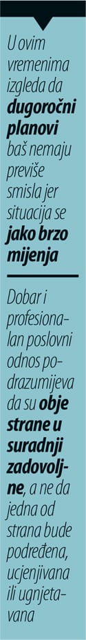 Unatoč tome što sada mnogi proživljavaju možda i najteže privatne i poslovne periode života, mišljenja sam da svaki stručnjak koji drži do sebe i do struke mora u nekom trenutku kupcu-klijentu reći dosta, ma koliko veliki ili mali bio. S obzirom na iskustva koja vidim u praksi, postoje slučajevi kada si kupac-klijent dozvoli prelazak granice poslovne pristojnosti i pritom praktično vrijeđa ili čak ucjenjuje dobavljača, što zaista nije i ne bi trebalo biti dozvoljeno.