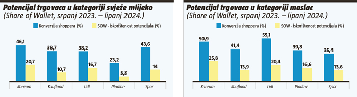 Među velikih 5 trgovaca, Konzum ima najveću konverziju shoppera u kategoriji (46%), a slijedi ga Spar s 44% kojem ujedno pripada tron trgovca s najvećim relativnim VPE indeksom. U odnosu na konkurente, Plodine imaju značajno manju iskorištenost potencijala svježeg mlijeka. Kada proširimo analizu na top 10 trgovaca, Tommy, NTL i Studenac izdvajaju se uspješnom konverzijom potencijala kategorije, s tim da je Studenac najuspješniji među konkurentima te je gotovo trostruko uspješniji u svježem mlijeku u odnosu na svoj FMCG prosjek.