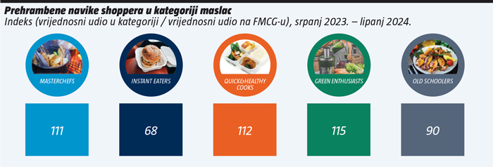 Masterchefs, Quick&Healthy i Zeleni entuzijasti najprikladniji su target za kupovinu maslaca, iako je penetracija kategorije najveća kod Old Schoolera. Instanteri su najmanje zainteresirani za kupovinu maslaca te su penetracijski i vrijednosno podzastupljeni u kategoriji.