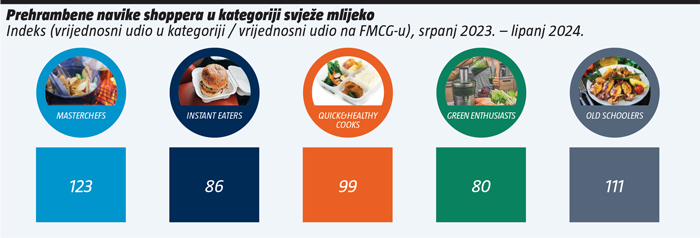 Od 5 tipova shoppera segmentiranih po prehrambenim navikama, Masterchefs i Old Schoolers su najprikladniji target za kupovinu svježeg mlijeka. Zeleni entuzijasti i Instanteri najmanje su zainteresirani za svježe mlijeko, dok je Quick&Healthy shopper podjednako zastupljen u kategoriji kao i na ukupnom FMCG tržištu, iako je penetracija kategorije najveća upravo u ovom segmentu.