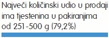 U zadnjih godinu dana, najveći količinski udio u prodaji ima tjestenina u pakiranjima od 251 – 500 g (79,2%), zatim pakiranja od 501 – 1000 g (19,4%) te ostala pakiranja (do 250 g i više od 1001 g) 1,4%.