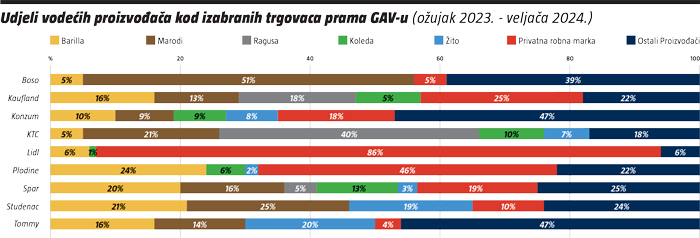 Analizirali smo i zastupljenost vodećih proizvođača kod izabranih trgovaca u zadnjem MAT razdoblju (ožujak 2023. – veljača 2024.) prema bruto oglasnoj vrijednosti. Analiza je pokazala kako je Barilla najviše udjela u GAV-u ostvarila u katalozima i letcima Plodina (24%), Studenca (21%) i Spara (20%). Marodi ima čak 51% udjela u komunikaciji trgovačkog lanca Boso, a zatim 25% kod Studenca i 21% kod KTC-a, a Ragusa ima čak 40% udjela kod KTC-a, zatim 18% kod Kauflanda i 5% kod Spara. Koleda najviše udjela ima kod Spara (13%), KTC-a (10%) i Konzuma (9%), dok je Žito najviše zastupljeno kod Tommyja s 20% i Studenca s 19% te nešto manje kod Konzuma s 8%. Ostali proizvođači najviše su GAV udjela ostvarili kod Konzuma i Tommyja (po 47%) te Bose (39%), a privatna robna marka najviše je zastupljena u komunikaciji Lidla s 86%, Plodina s 46% te Kauflanda s 25%.