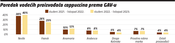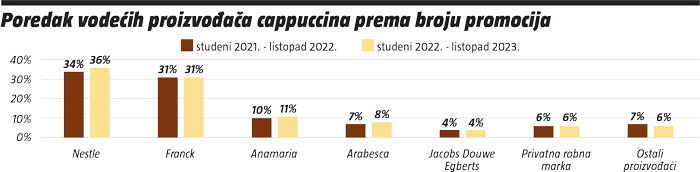Kod cappuccina nije sve tako jednoznačno jer vodeći Nestle ipak ima jaču konkurenciju. Naime, Nestle je prema broju promocija vodeći s 36% i rastom od 2%, dok je na drugom mjestu vrlo blizu Franck s 31% udjela u oba razdoblja. Anamaria je imala minimalan rast i sada drži 11%, Arabesca je na 8%, a Jacobs Douwe Egberts na 4%. Ostali proizvođači kao i privatne robne marke ostvarili su po 6% udjela prema broju promocija cappuccina.