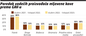 I prema bruto oglasnoj vrijednosti Franck je vodeći s 36% udjela i rastom od 2%, a slijede Droga Kolinska s 13% (-1%), Arabesca s 12% (+1%) i Anamaria s 10% u obje godine, dok je ostalim proizvođačima također u oba perioda pripalo 18% udjela prema GAV-u. Privatne robne marke izgubile su 2% i sada imaju 10% udjela.