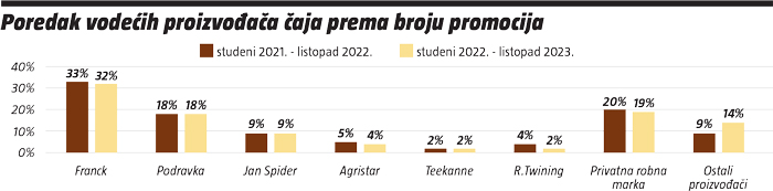 Prema broju ostvarenih promocija na vrhu poretka proizvođača čaja je Franck čija je bila svaka treća promocija ove kategorije. Ovaj je proizvođač, naime, zauzeo 32%, što je za 1% manje nego lani, a slijedi Podravka s 18% u oba promatrana godišnja perioda. Ispod granice dvoznamenkastog udjela smjestili su se Jan Spider s 9%, Agristar s 4%, Teekanne i R.Twining imaju po 2%, a ostali proizvođači povećali su svoj udio za 5% i sada imaju 14% udjela. Privatne robne marke drže oko petine udjela prema broju promocija, ukupno 19% (-1%).