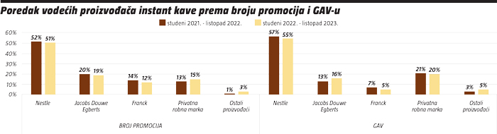 Kod instant kave na vrhu je daleko odmakao Nestle s 51% udjela prema broju ostvarenih promocija, uz minimalni pad od 1%, dok je petina udjela od 19% pripala Jacobs Douwe Egbertsu uz minimalan pad. Franck je malo smanjio svoj udio za 2% i sada ima 12%, dok su ostali proizvođači jedva primjetni s 3%. Privatne robne marke malo su napredovale (+2%) i sada drže 15% udjela prema broju promocija.