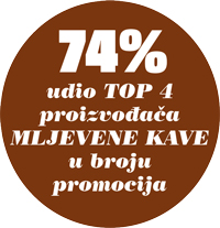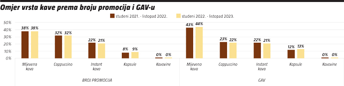 Mljevena kava je prema broju promocija na vrhu poretka s 38% u oba godišnja razdoblja, a s nešto malo zaostatka slijedi cappuccino s 32%, također u oba razdoblja. U zlatnoj sredini je instant kava koja drži 21% udjela uz blagi pad od 1%, dok su kapsule imale takav minimalan rast i sada drže 9% udjela.