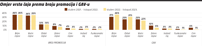 Gledamo li broj promocija, biljni čajevi s 36% za nijansu su odnijeli primat ispred voćnih čajeva koji su zauzeli 35% udjela. Pritom su obje vrste imale vrlo stabilnu godinu pa su tako biljni čajevi zauzeli isti udio kao i prošle godine, dok su voćni istodobno rasli tek za 1%. Jednako tako stabilni, ali s dosta manje prisutnosti, su ostali čajevi koji su u oba godišnja razdoblja zauzeli 13%. Slijede zeleni čajevi sa 7% te crni i instant čajevi koji imaju po 3% i funkcionalni čajevi s 2% udjela prema broju promocija.