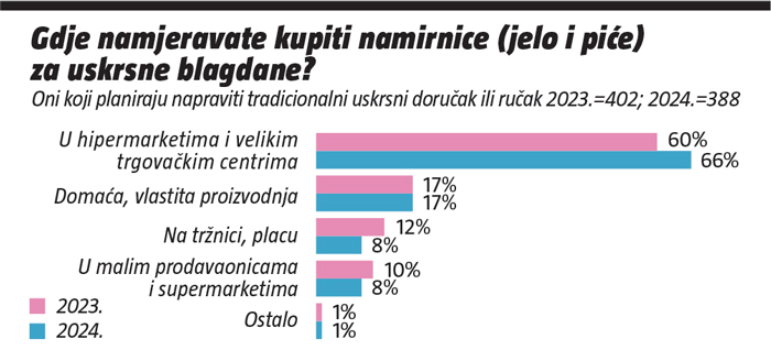Nadalje, uvijek je važno pitanje mjesta odakle će se građani opskrbiti namirnicama za Uskrs pa je tako i ove godine najveći dio kao svoj prvi izbor naveo hipermarkete i velike trgovine, gdje će kupovati dvije trećine njih (66%), što je za 6% više nego lani. Iz domaće, vlastite proizvodnje opskrbit će se 17% građana, jednako kao i prošle godine, a malo su pali supermarketi i male prodavaonice gdje će ove godine kupovati 8% građana ili 2% manje nego lani, a jednako toliko ih planira opskrbu obaviti na tržnici samo što je ovdje riječ o značajnijih 4% pada (lani je na tržnici kupovalo 12% građana).