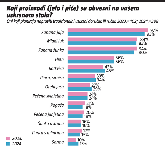 Sada dolazimo do spomenutih svima zajedničkih proizvoda po kojima se Uskrs poznaje pa će tako 93% građana na svom uskrsnom stolu imati kuhana jaja (lani je to bilo 97%), a slijede mladi luk s 83% (-1%) i kuhana šunka s 80% (-4%). Nema tu nekih značajnih odstupanja pa ćemo dalje navesti samo udjele ostvarene u ovogodišnjem istraživanju: hren ima 56%, rotkvica 45%, pinca ili sirnica 34%, orehnjača 29%, pečena svinjetina 24%, pogača i pečena janjetina imaju po 18%, šunka u kruhu 16%, purica s mlincima 15% i sarma na kraju 13%.
