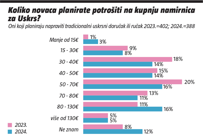 Pritom će ususret Uskrsu najveći broj građana, njih 16%, za kupnju namirnica izdvojiti od 50-70 eura, dok je to lani bilo ipak nešto većih 20% građana. Za razliku od toga, za nemalih 5% porastao je i broj građana koji planiraju izdvojiti znatno veći iznos, od 80-130 eura, kojih ove godine ima također 16%. Potom slijede iznosi od 30-40 eura i 40-50 eura koje će izdvojiti po 14% građana, a njih 11% planira potrošiti nešto više od toga, odnosno od 70-80 eura.